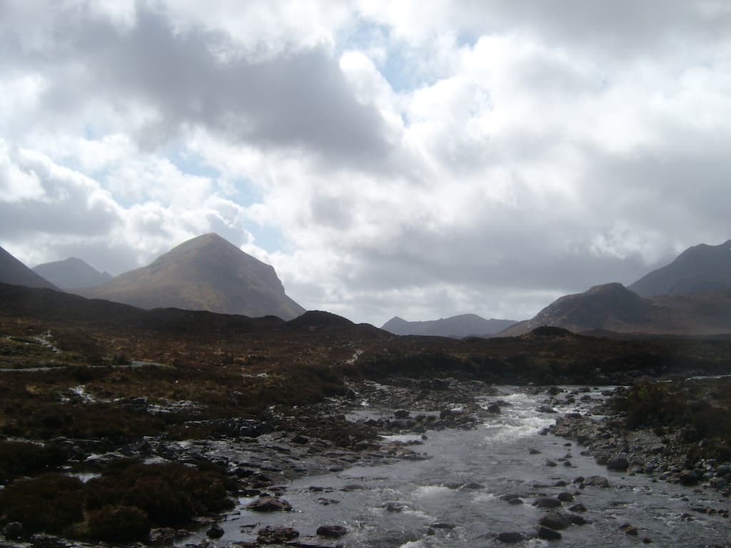 Op 16 mei vertrekken we vroeg uit de B&B om de ferry van 9.15 uur van Mallaig naar Armadale op Isle of Skye te halen. We zien bij het wegvaren nog drie motoren te laat aankomen. Da's balen, want het betekent voor hen wachten tot de volgende ferry om 10.45 uur. Na de vaart van een halfuur rijden we op Skye over de A851 naar Skulamus en draaien dan de prachtige A87 op. Het weer lijkt ons gunstig gezind: harde wind, maar een prachtige zon. We volgen de weg tot aan de splitsing bij Sligachan en drinken daar wat in het café. Het is inmiddels gaan hagelen en de temperatuur is gezakt van 9 tot 2 graden. Let wel: het is half mei!