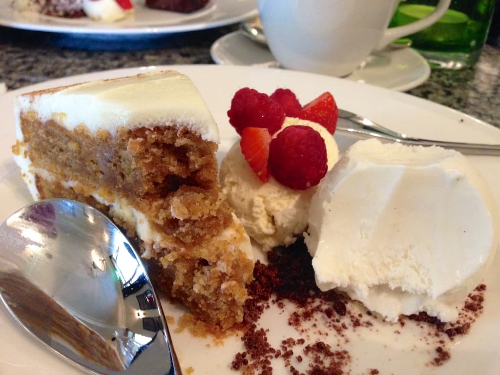 We zijn, op de stille zondagmiddag, inmiddels wel in voor een lunch, maar in alle kleine plaatsjes zijn de cafés en bars, als ze al aanwezig zijn, dicht. We schieten dus maar net voor Dulnain Bridge de oprijlaan van Hotel Muckrach op. Dat blijkt geen verkeerde keuze, want we eten er een heerlijke dark chocolade brownie en een carrot cake, allebei geserveerd met witte chocolademousse en een bolletje ijs. Toegegeven, het is een vreemde lunch, maar je moet wat op zondagmiddag in de middle of nowhere en het smaakt er niet minder om. Het hotel lijkt overigens een toevluchtsoord voor jagers en oud geld en enigszins underdressed kijken we onze ogen uit - erg statig allemaal. We vervolgen de weg over de A939 langs Bridge of Browne, Tolmintoul (leuk dorpje), Lecht en Cock Bridge. Door de scherpe bochten en de hele dag klimmen en dalen - een combinatie die overigens zorgt dat je met de volle aandacht bij de weg moet blijven, want je doorziet bochten soms pas als je erin zit - raken de tanks snel leeg en zijn we blij dat we Ballater bereiken. Ballater is erg druk en ziet er leuk uit; een mooie kerk, wat cafeetjes en genoeg slaapplek. We twijfelen of we nog een stukje doorrijden, want dit ziet er uitnodigend uit. We besluiten toch ons doel van vandaag, Banchory, in het zicht te houden en rijden nog dertig kilometer door.